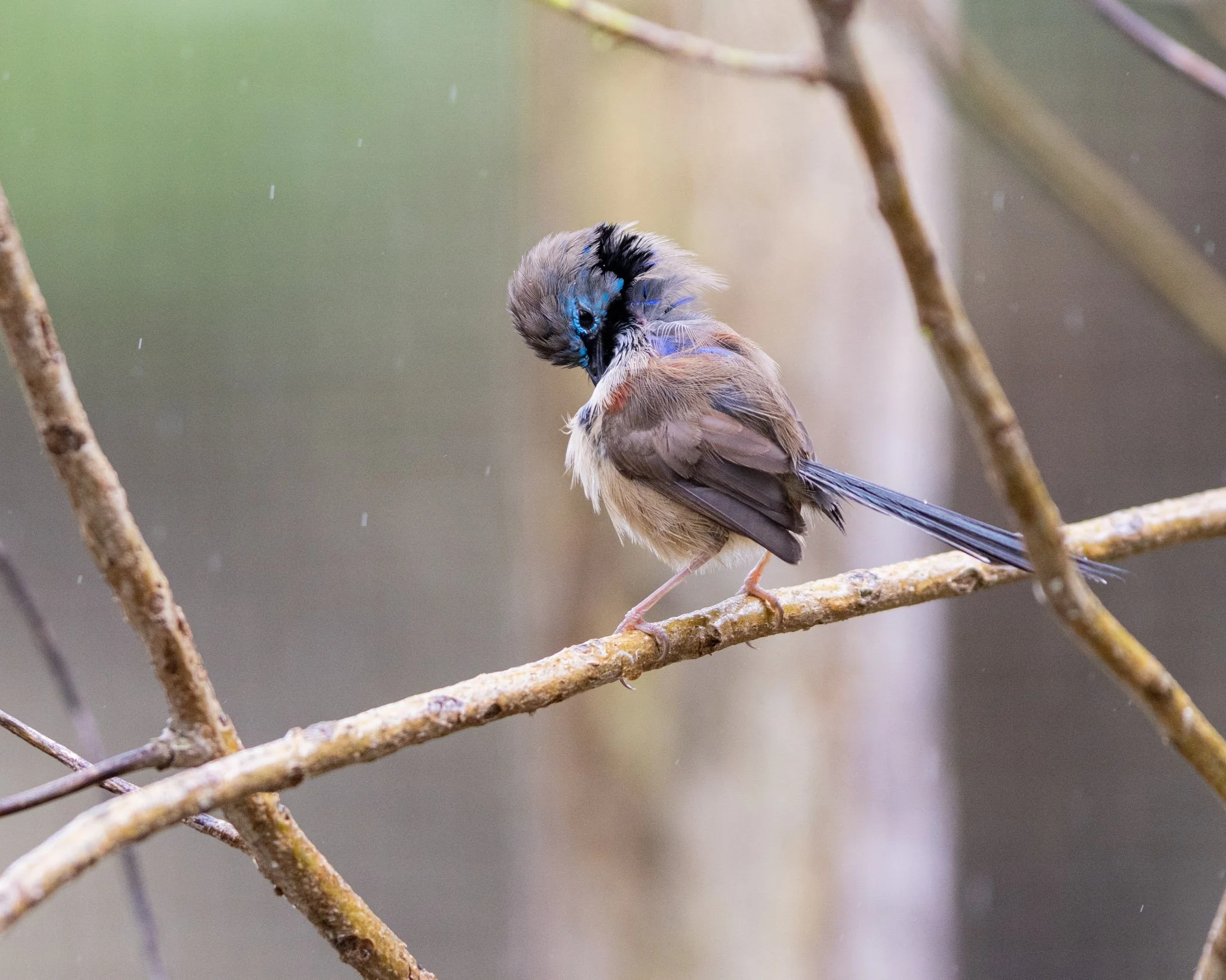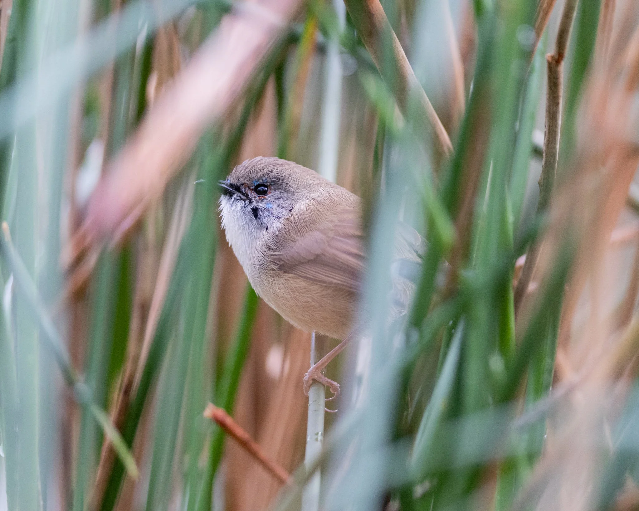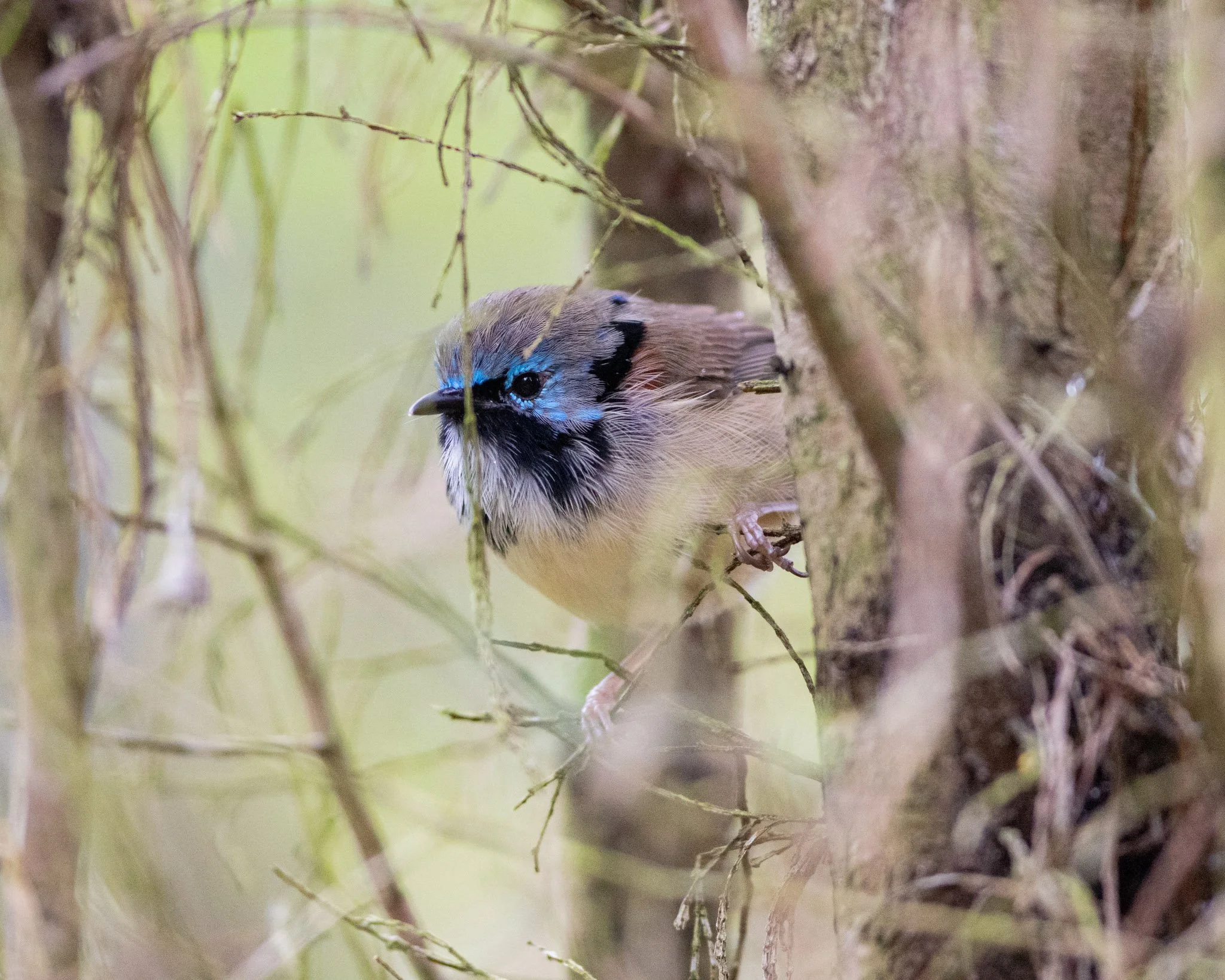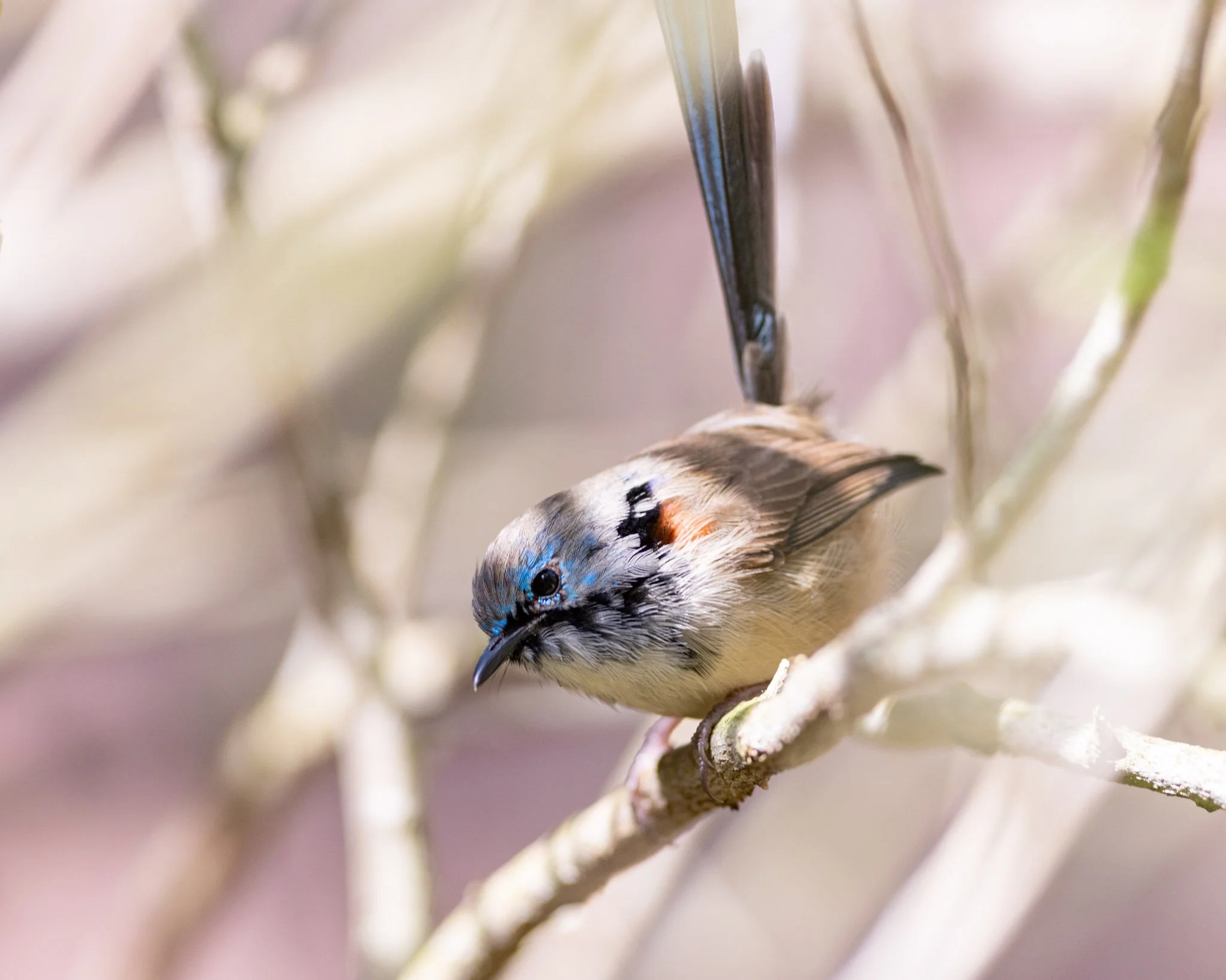 I take a break from visiting Taronga zoo over the July school holidays, and I hadn’t expected him to change much from what I had observed in wild populations of fairywrens. I knew that there were often young adult males moulting into their first breeding moult late into summer (starting as late as December), and it looked as if they took somewhere between 1-2 months to moult most of the way. Some older males in the wild were already finishing their moult, and I knew the dad didn’t end up changing this year; so I was rather surprised to see the little guy with a splash of black feathers around his eyes at the end of July. I didn’t know the date of his birth, but it looked as if he might have been born earlier in the previous breeding season.